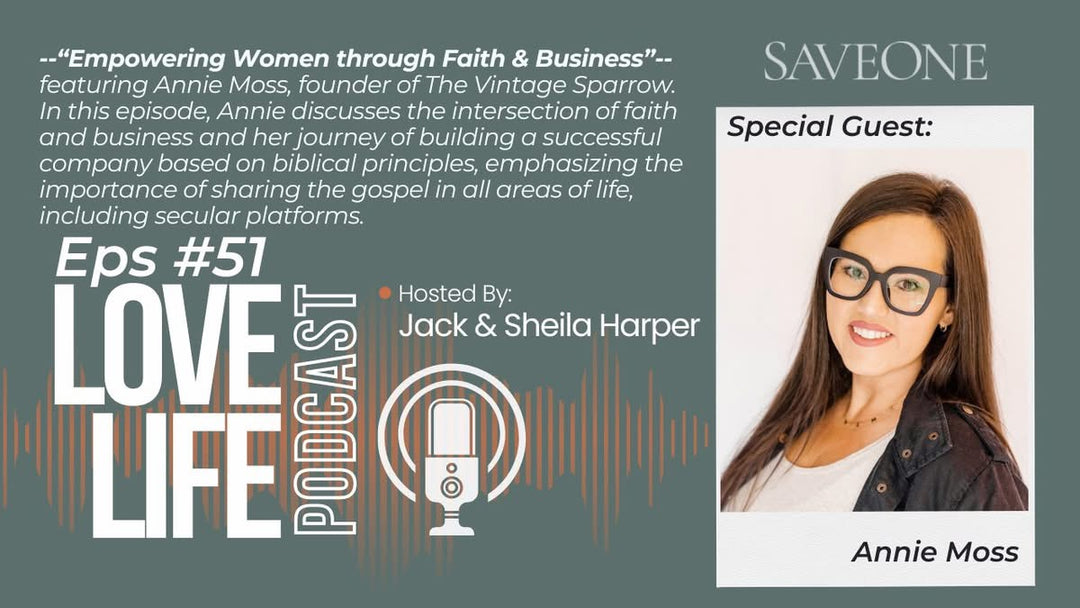 In this episode of the Love Life podcast, Jack and Sheila Harper sit down with Annie Moss, founder of The Vintage Sparrow, to talk about faith and business, sharing how biblical principles, God-sized dreams, and small beginnings shape her mission to inspire women through scripture while creating space for joy and rest.